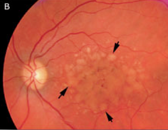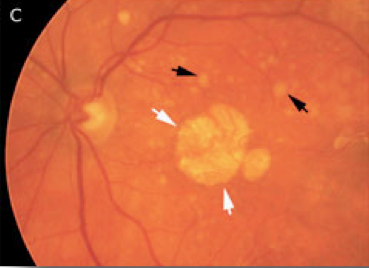 A sinistra: macula sana. Al centro: drusen confluenti (frecce nere). A destra: forma secca della degenerazione maculare senile con atrofia della macula (frecce bianche) e drusen (frecce nere)