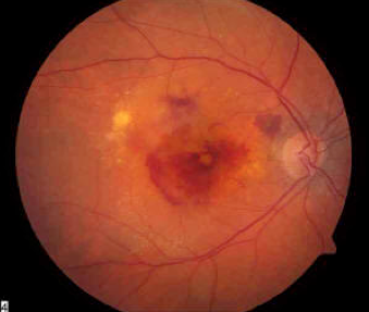 A sinistra e al centro: forma umida della degenerazione maculare senile con emorragia maculare. A destra: stadio finale con cicatrizzazione della macula (maculopatia disciforme)